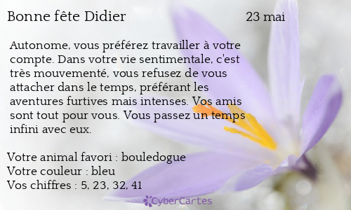 Le 23 mai cest la fête de Didier envoyez-lui vite une carte originale et gratuite pour lui faire plaisir. Il a été fréquemment utilisé au XIXe siècle principalement en Bourgogne en Flandres ou dans quelques provinces du nord. Bonne fête aux Didier.